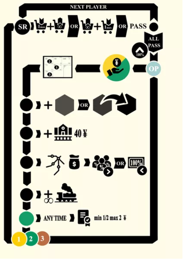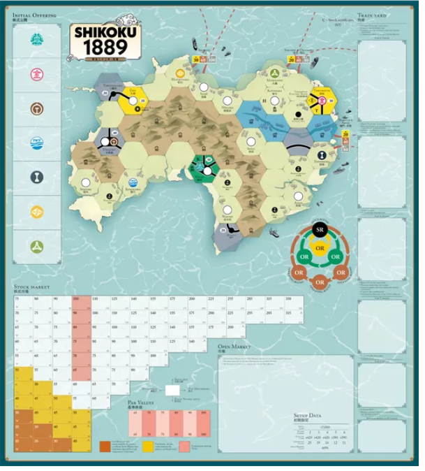 In 1889, 2-6 players will use money to purchase shares in railroad companies during Share Dealing Rounds. Between subsequent Share Dealing Rounds, railroad corporations then conduct operations on the game board, with the decisions being made by the player who is the major share holder. The game simulates the progression of railroad development during an historic period on Shikoku. Old trains become obsolete while the revenue earnings from cities grows over time. Players will try to purchase the most profitable shares at the right times of the game to maximize earnings in dividends and stock value gains. In the end, the player with the highest value of personal cash and held stocks is the winner.