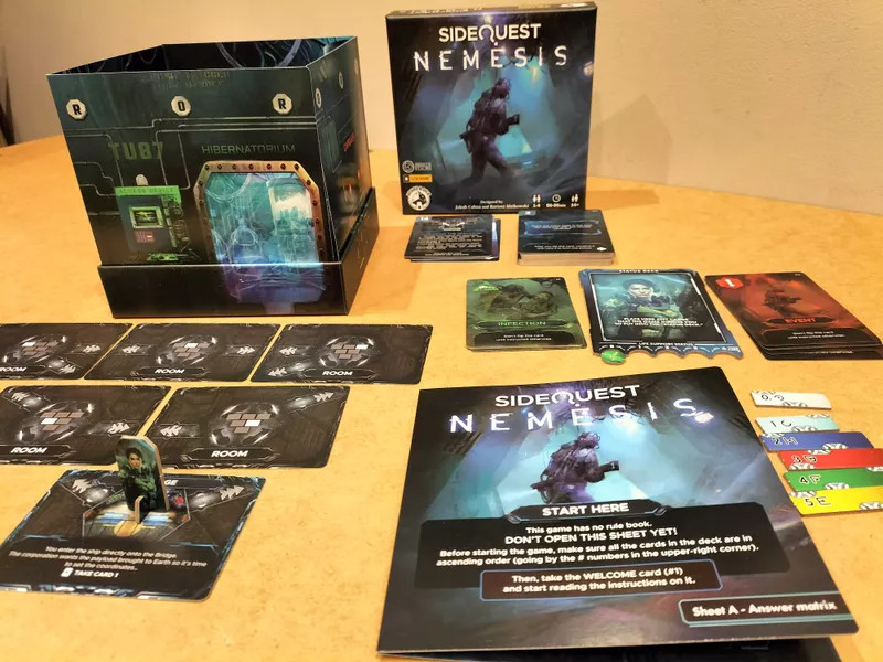 1–4 Players 90–120 Min Playing Time Age: 14+ Captain Jessica Kowalski #39;s crew has been offered another offer from the Corporation. Apparently, a ship carrying a precious load vanished a few weeks ago. The mission was simple: locate the ship, assess the situation and make sure the cargo reaches Earth. However, the last log entry was rather unsettling. She recorded: the AI of the ship detected alien lifeforms, labelled Intruders, aboard. Silence is scarier than usual… SideQuest: Nemesis is a game of puzzles and enigmas by the designers of the Escape Tales series, but now in the Nemesis universe. SideQuest: Nemesis offers captivating puzzles, an interesting scenario and difficult choices to make while under pressure. The game will test your creativity, your perception, your open-mindedness. Be aware the silence aboard is not a good sign and intruders are hiding in the darkness. Complete your mission and avoid being contaminated at all costs!