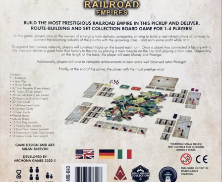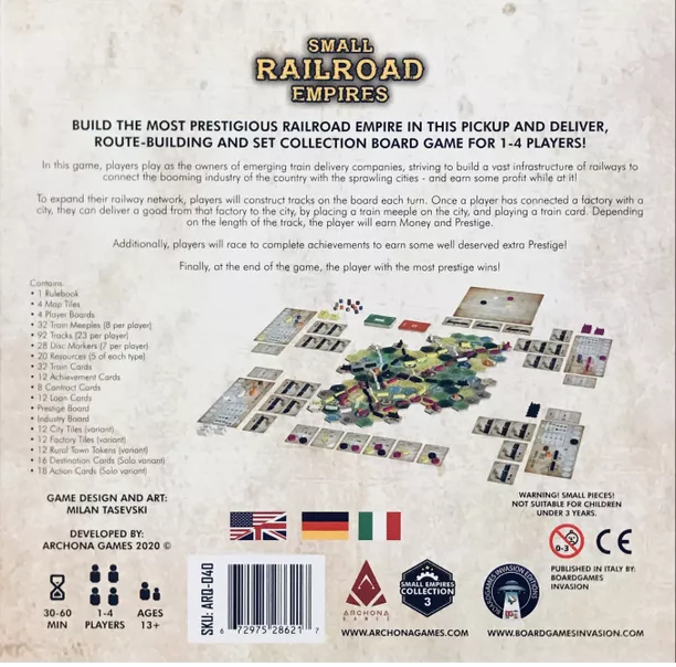 Small Railroad Empires is a pickup and deliver, track-laying and set-collection board game for 2-4 players, where players build railroad tracks, send trains with goods from industries to cities, and complete achievements to earn prestige!