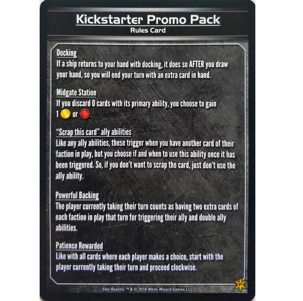 Kickstarter Exclusive Promo Pack for Star Realms Frontiers by Wise Wizard Games. Includes 34 KS Exclusive cards from the Star Realms Frontiers Kickstarter campaign. Requires core game to play (sold separately).