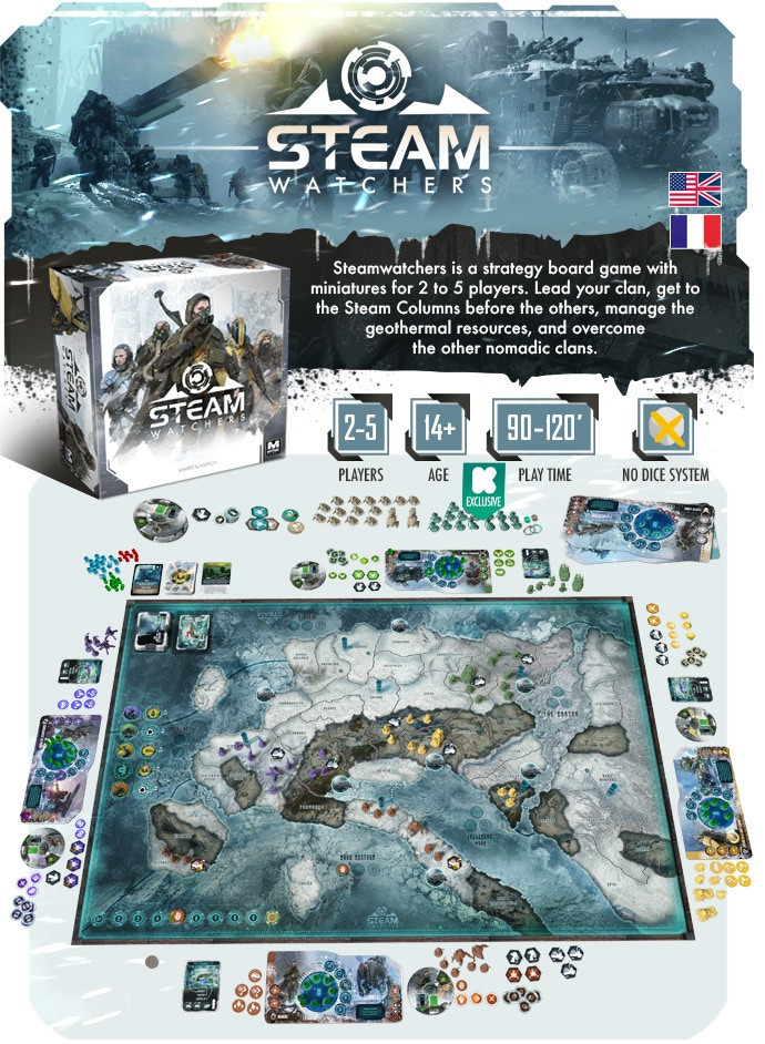 Steamwatchers is a 2 to 5 player game in which you play as the leader of a nomadic clan. You will struggle over the geothermal resources of Europa in scenarios that last from 3 to 6 rounds. At the end of the last round of the chosen scenario, the winning clan is the one with the most geothermal resources (steam columns and farms), but a clan can claim victory before the end of the scenario by acquiring 10 geothermal resources.
