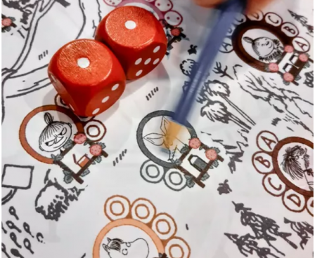 In the roll-and-write game StegegetS Moomin, you will find many characters from the Moominvalley. As a player, you travel around Moominvalley to visit them on picnics in nature and to collect treasures — jam, marmalade, and such — given to you by them from their earth cellars.