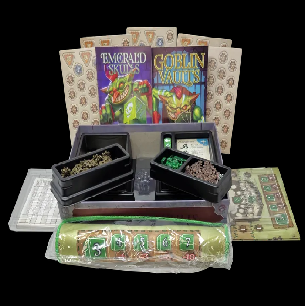 The Swindler's Chest includes all gameplay content from Emerald Skulls and Goblin Vaults. The chest also includes a double-sided playmat (one side for each game) and 3 plastic trays for easy game setup and storage. Additionally, the larger box supports sleeved cards for both games!