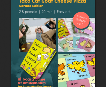 Taco Cat Goat Cheese Pizza is filled to the brim with hand-slapping mayhem! As in Snap and Dobble, each player places a card from their hand face up into a community pile while saying taco/cat/goat/cheese/pizza in player sequence. When the card matches the mantra — boom! — everyone slaps their hand on the deck, with the last one to slap picking up the cards. Whoever rids themselves of cards first wins!