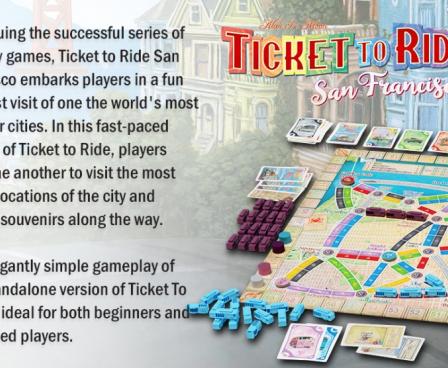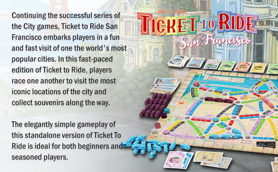 Ticket to Ride: San Francisco features the familiar gameplay from the Ticket to Ride game series — collect cards, claim routes, draw tickets — but on a map of 1960s San Francisco that allows you to complete a game in no more than 15 minutes.