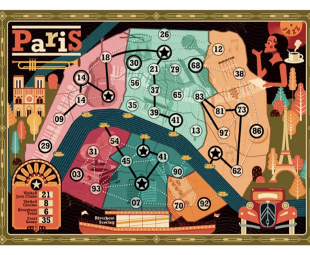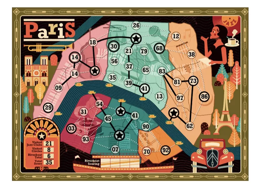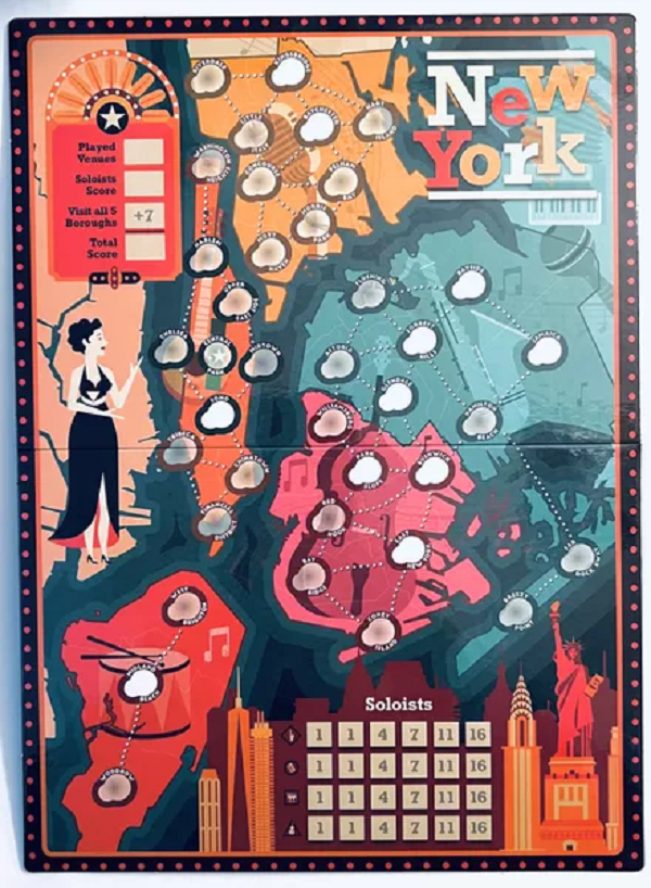 Your goal is to plot the longest and most efficient route through these two magnificent cities where you are musicians in the 1920's trying to play in as many jazz clubs as possible. Each turn two ten-sided dice are rolled to make two two-digit numbers that determine where you visit (a roll of 3 and 7 creates the numbers 37 and 73). All players write each of those numbers in a location on their map. The regions they can write in are restricted by cards turned up in the middle of the table.
