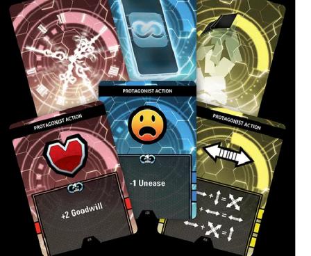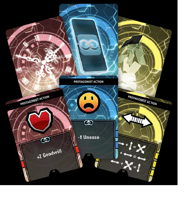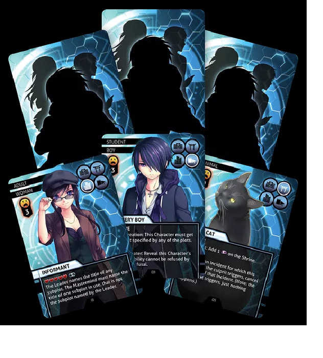 In Tragedy Looper: New Tragedies, 1-3 players are Protagonists attempting to escape a time loop engineered by one player acting as the Mastermind. The Mastermind player selects a script, either one of the 13 scripts included or one created themselves, and sets up the game accordingly. The Protagonist players don't yet know the details of the tragic events about to unfold.