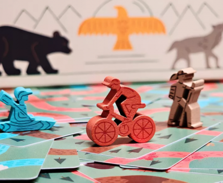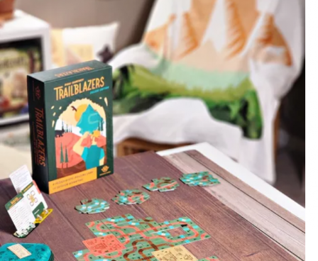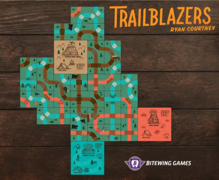 In Trailblazers, players compete to earn the most points by building biking, hiking, and kayaking loops from their campsites of the matching trail type. Each round, players are dealt eight trail cards where they’ll draft two cards, arrange those cards in their personal area, and pass their hand to the next player three times. Cards must either be placed adjacent to or overlapping other cards. While players can push their luck by aiming to construct long and elaborate trails, only closed loops that start and end at a matching campsite will score points. Players also compete to fulfill “First To” and “End Game” goal cards. After four rounds, the game ends and the player with the most points from closed loops and goal cards wins.
