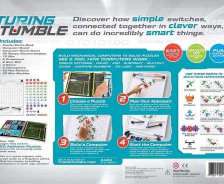 Turing Tumble is a completely new type of game where players (ages 8 to adult) build marble-powered computers to solve logic puzzles. It'''s fun, addicting, and while you'''re at it, you discover how computers work. The logic isn'''t hidden inside a computer chip ''" it'''s all right there in front of you. No electronics at all.