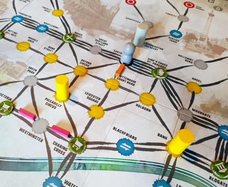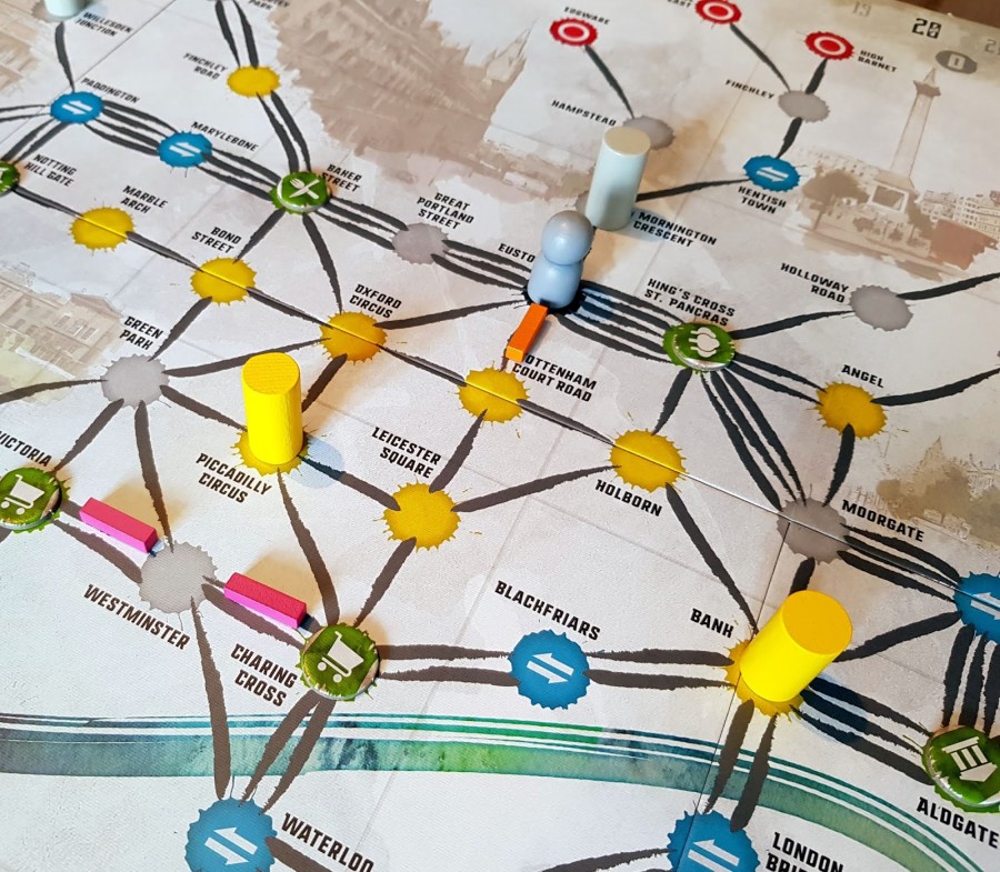 After each player's turn, a passenger token is moved along players' lines, avoiding walking as much as possible, to reach one or two destinations determined at the beginning of the turn. The destination cards corresponding to the visited stations are then replaced by new ones, then the next player takes their turn.