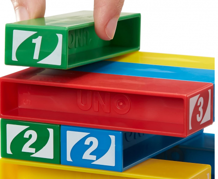 Game play combines the strategy of UNO with a physical task requiring patience and finesse.