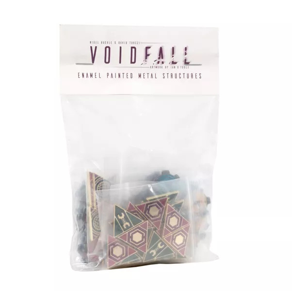 This component upgrade for Voidfall includes 72 double-sided, enamel painted metal tokens to replace the cardboard tokens for Installations (Shipyard, Sector Defense, Starbase), and Guilds (Farmers, Engineers, Miners, Scientists, Bankers).
