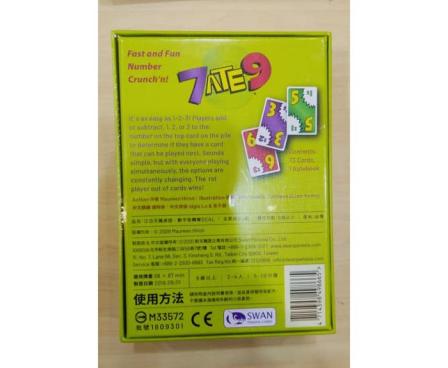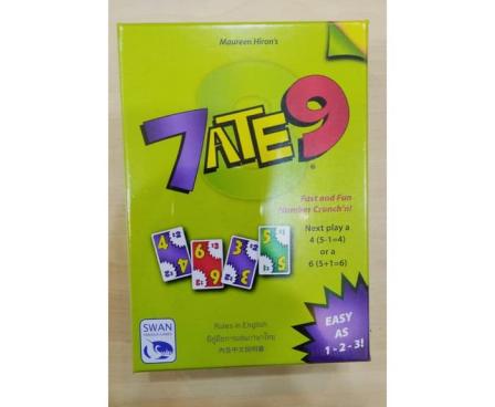 7 Ate 9 is a quick-playing card game in everyone wants to rid themselves of cards as quickly as possible — but you can't play just any card you want! Each card features a large numeral (1-10) as well as a smaller numeral in the corner (±1, ±2, or ±3).