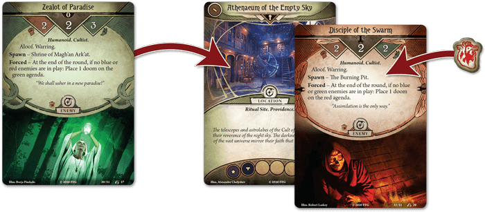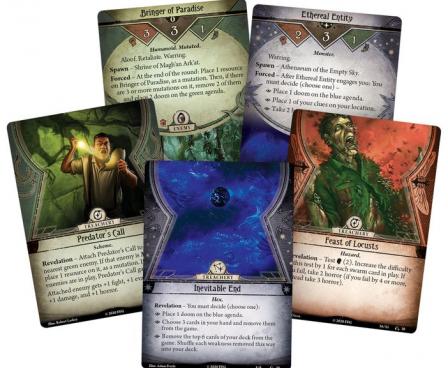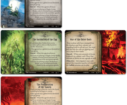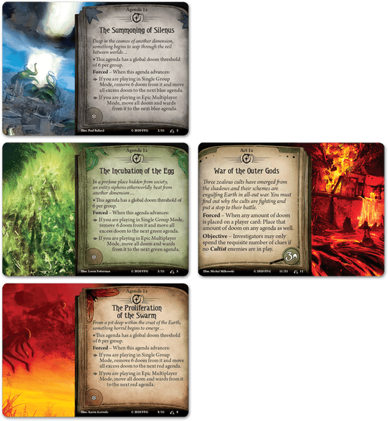 In War of the Outer Gods, a new scenario pack for Arkham Horror: The Card Game, Arkham is caught in the midst of a world-shattering conflict between three rival cults, raging across all of North America. Each of these cults seeks to summon its own Ancient One—and as they battle each other across the continent, every enemy slain brings one of these dark gods closer to awakening. Can you and your fellow investigators survive being caught in the middle of this war, or will our world be torn asunder?