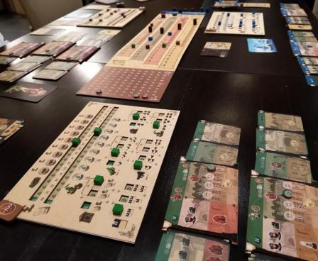Then, the production phase starts, where every player who owns a factory of the current good produces those goods. The market fluctuates with the general demand, so the demand may be lower than the value of your current good, lowering your profit. Workers must be paid, and machines need regular maintenance, so you can possibly lose money instead of turning a profit. Selling enough of one good improves your share value, and there are bonuses for having the highest appeal. Lastly, if you can’t sell your goods to the home market, you can ship them overseas or store them for future rounds.