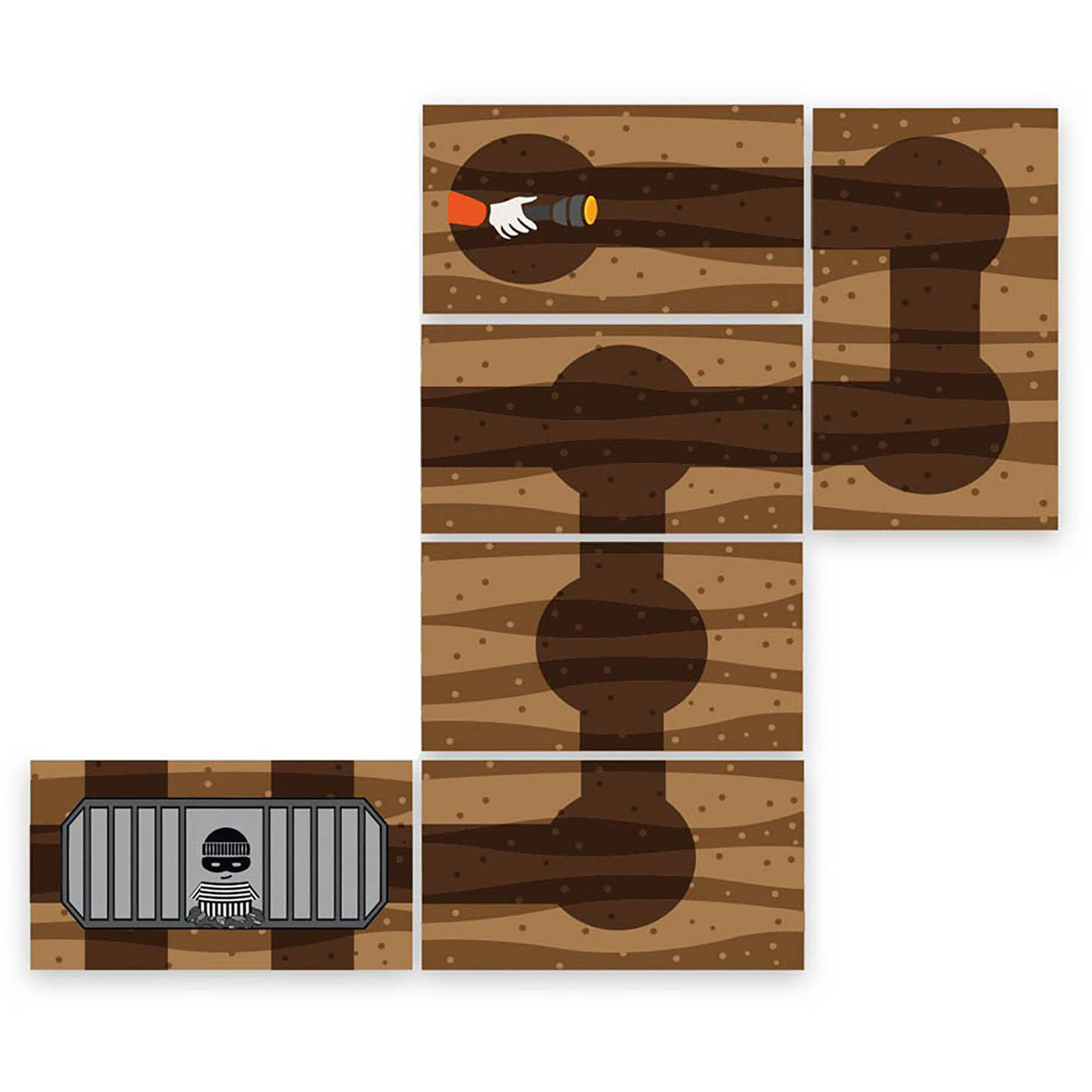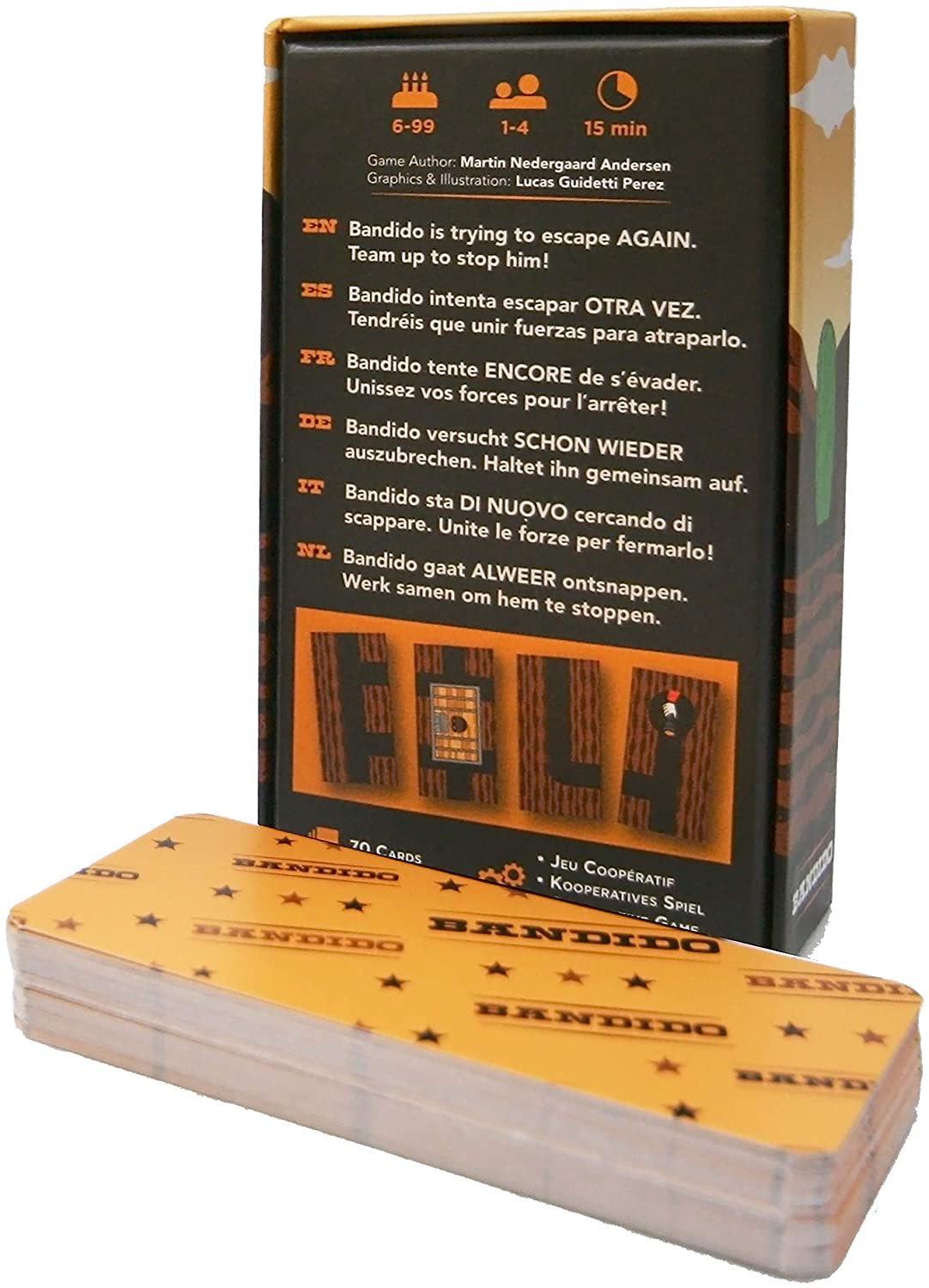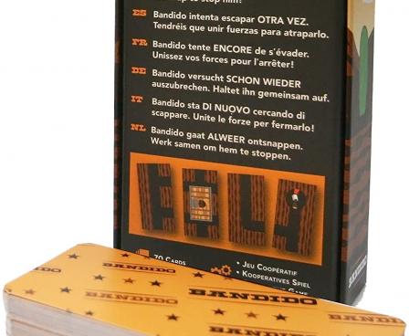 A light-security prisoner is trying to escape through tunnels starting underneath his cell. Will you be able to join forces and cards to stop him? Bandido is a cooperative game of strategy and observation for the entire family.