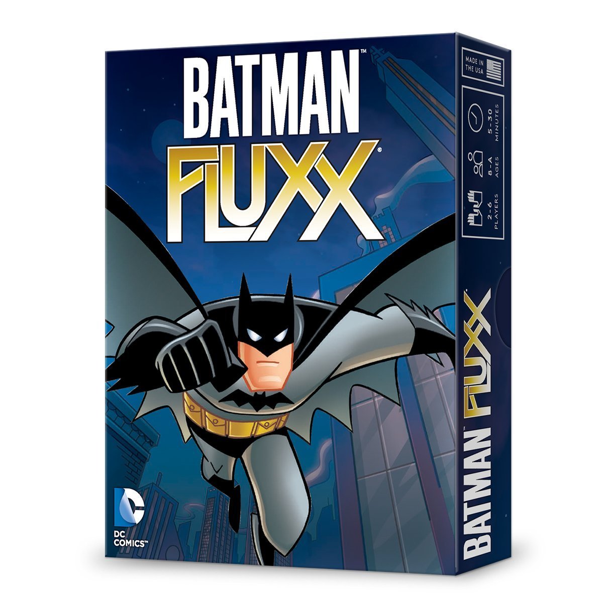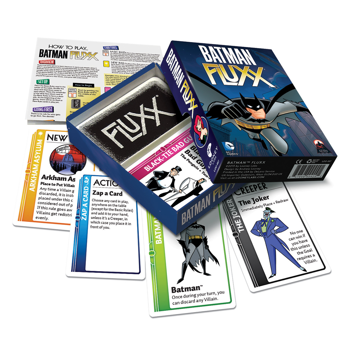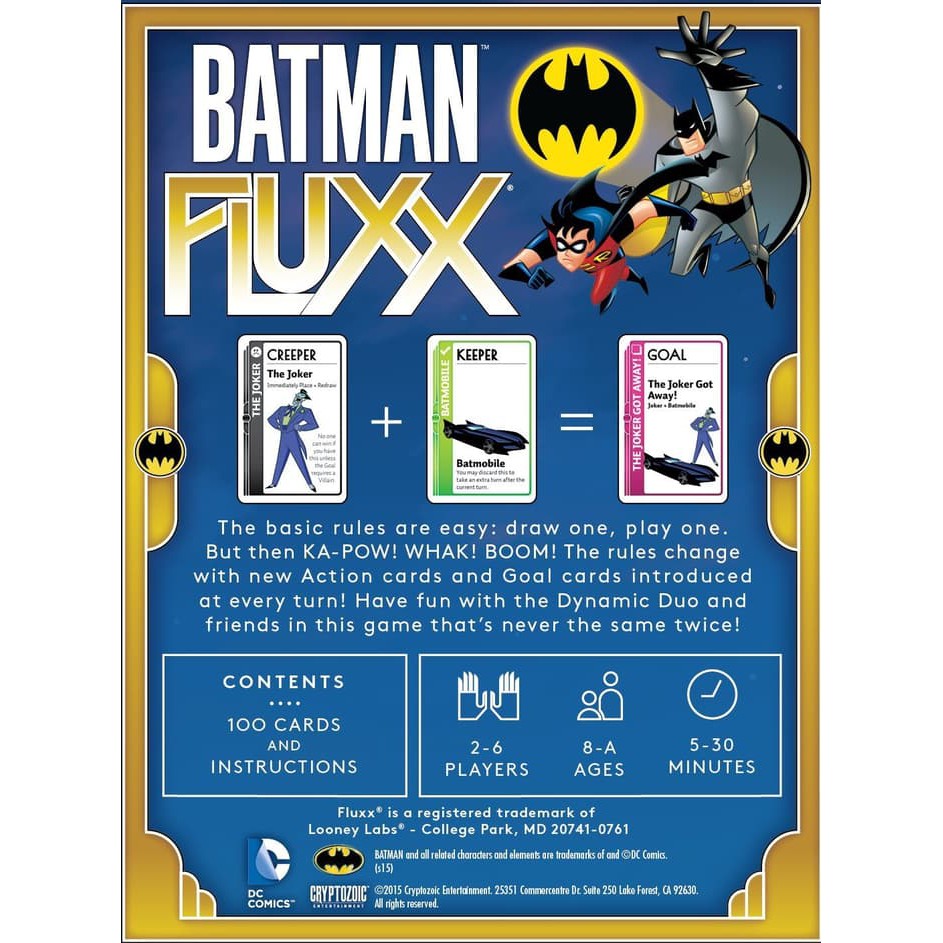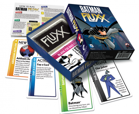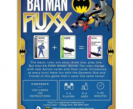 In Batman Fluxx, crime is running amok and no one can win with Villains on the table, so put on your utility belts and leap into the fray to help Batman and his friends clean things up!
