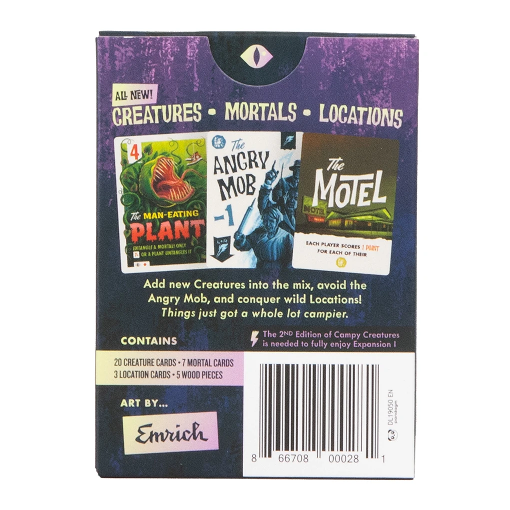 Campy Creatures: Expansion I adds more Creatures, more Mortals, and more Locations into the mix. The Expansion works as a modular system allowing players to change-in and change-out the Creatures or Mortals they would like to play with for that game.