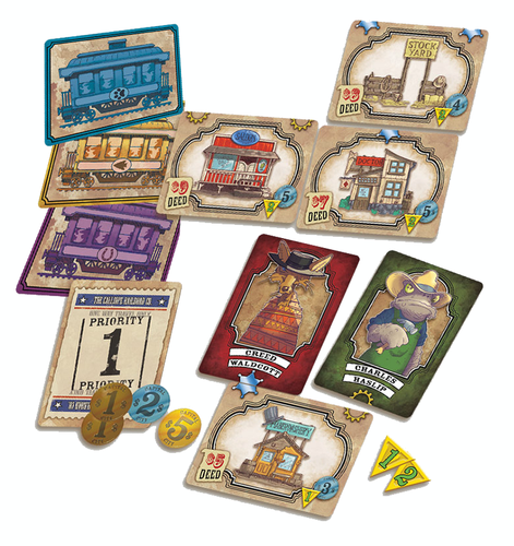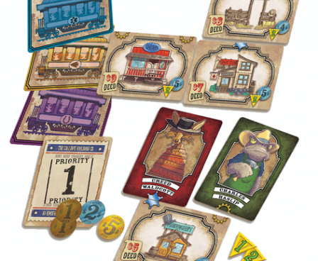 In more detail, players have four rounds represented by the seasons of the year to expand their Wild West town! First, they bid for player priority order for the current season. Next, they choose character cards from the train to put to work, then purchase building cards to form Main Street. Then, players attach character cards to the building cards to earn dollars or VPs! Attached characters are workers that provide bonuses to the current player and other players with characters from the same family! At the end of four seasons, the player with the most VPs wins! Yee-haw!