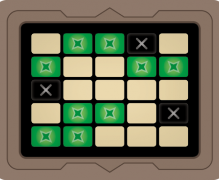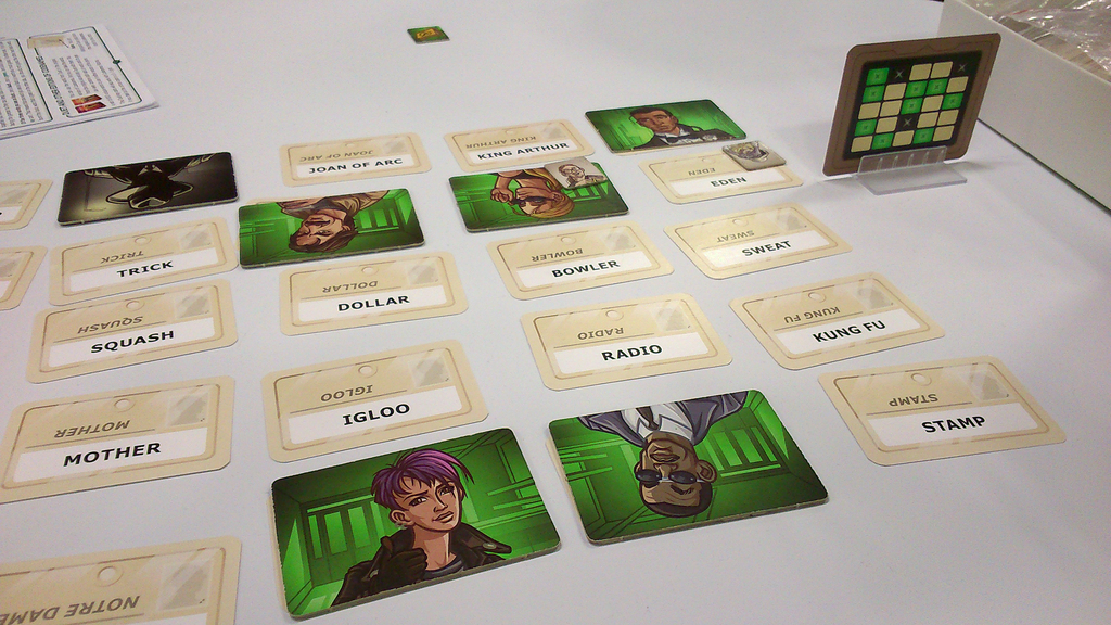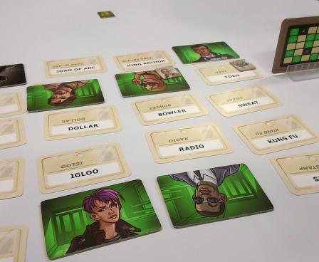 To set up play, lay out 25 word cards in a 55 grid. Place a key card in the holder so that each player sees one side of the card. Each player sees a 55 grid on the card, with nine of the squares colored green (representing your agents) and three squares colored black (representing assassins). Three of the nine squares on each side are also green on the other side, one assassin is black on both sides, one is green on the other side and the other is an innocent bystander on the other side.