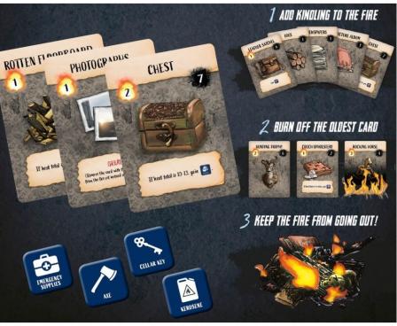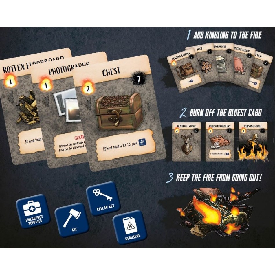 The Coldest Night is a cooperative strategy card game where players feed fuel into a fire to keep it lit. Each card brings a certain amount of heat to the fire, and also requires the fire to be above a certain heat to burn it. With the fire constantly dying out, players must work together against the encroaching cold to sequence their cards so everything in the deck can be burned.