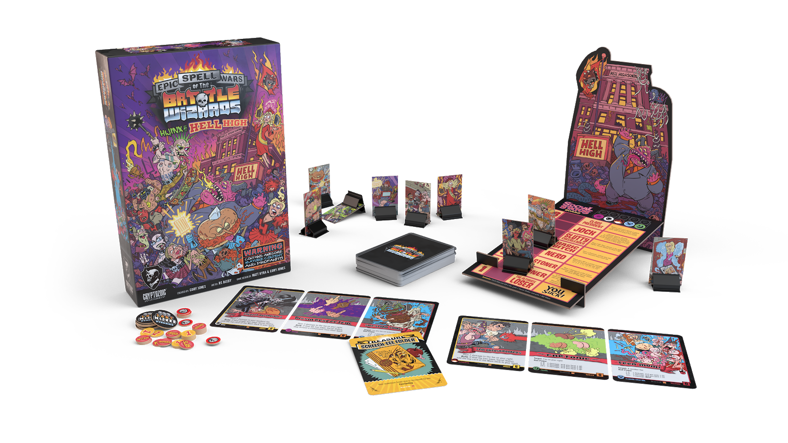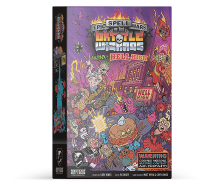 Epic Spell Wars of the Battle Wizards: Hijinx at Hell High, the fifth Epic Spell Wars title, brings all the spell-crafting and trademark over-the-top humor and art to the world of high school. In the game, 2-6 players move up and down the Social Status Board, which ranges from the Ultimate Loser to Class President, and utilize the new keyword "Bully" as they try to annihilate their fellow wizards