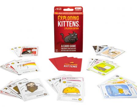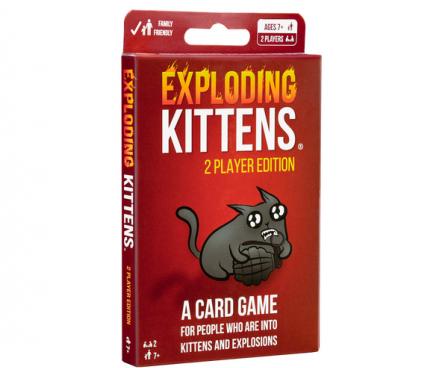 This compact 2-player edition of Exploding Kittens lets you go head to head with just one other person, whenever, wherever. Exploding Kittens is a highly strategic, kitty-powered version of Russian Roulette. Draw an Exploding Kitten and you lose. Play and use other cards to make someone else draw the Exploding Kitten, so they lose and you win.