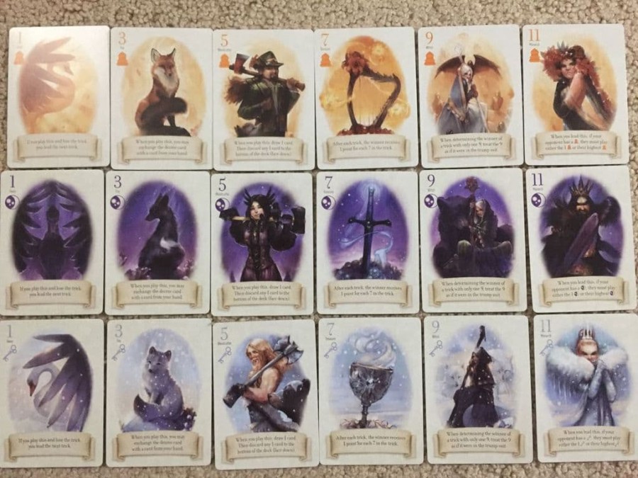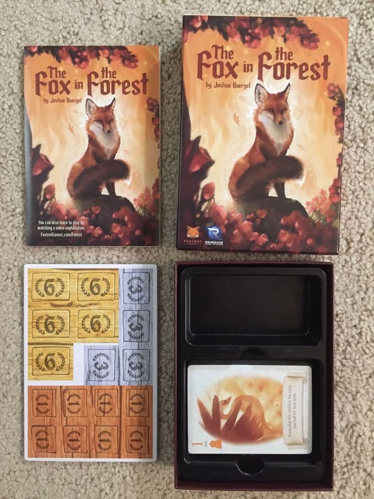 The Fox in the Forest is a trick-taking game for two players. Aside from the normal ranked- and suited-cards used to win tricks, fairy characters such as the Fox and the Witch have special abilities that let you change the trump suit, lead even after you lose a trick, and more.