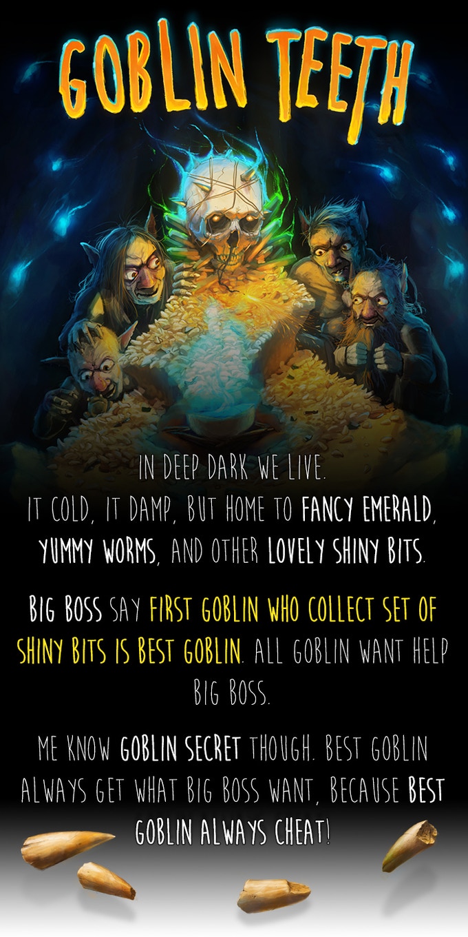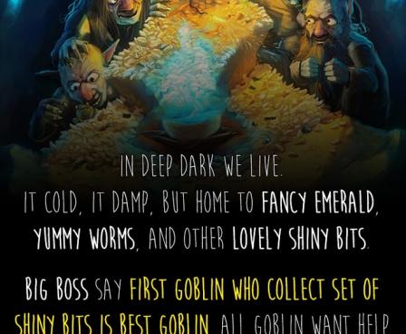 In deep dark we live. It cold, it damp, but home to fancy emerald, yummy worms, and other lovely shiny bits. Big Boss say first goblin who collect set of shiny bits is BEST goblin. All goblin want help Big Boss. Me know goblin secret though. Best goblin always get what Big Boss want, because best goblin always cheat!