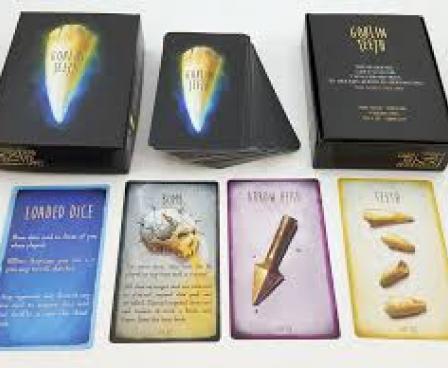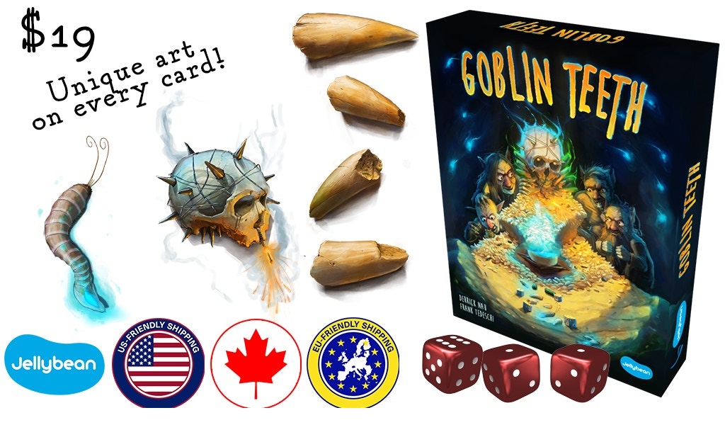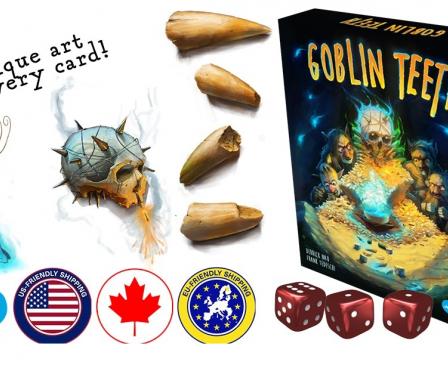 Goblin Teeth is a dice game for 2-5 players. You play as a goblin, bidding on valuable goblin items with goblin dice and using goblin Cheat cards from your goblin hand to gain advantages over the other goblin players. The round ends when everyone has placed all of their dice; each Item is awarded to the goblin who bid the most for it. Be the first to complete an Offering for the Big Boss to win!