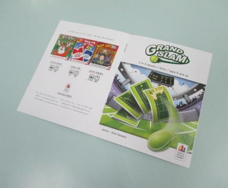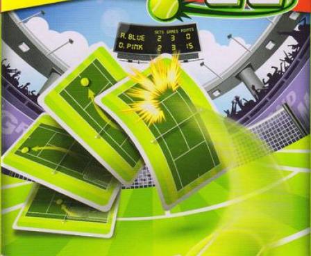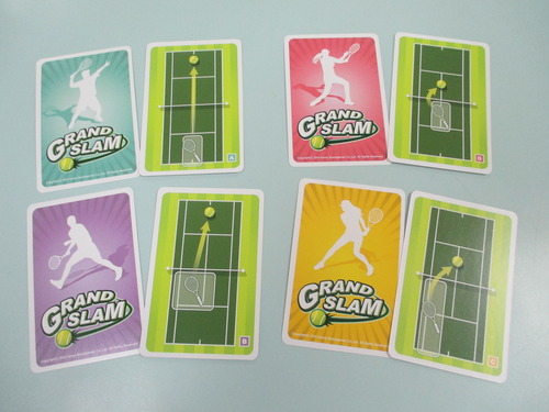 In Grand Slam, originally titled Love Means Nothing, each player has a deck of 24 cards, each of which depicts two parts of a tennis court: One half-court can be used for defense, returning a ball that comes your way; the other half-court can be used for offense, sending a shot across the net. You never use both halves of the card at once — either one or the other.
