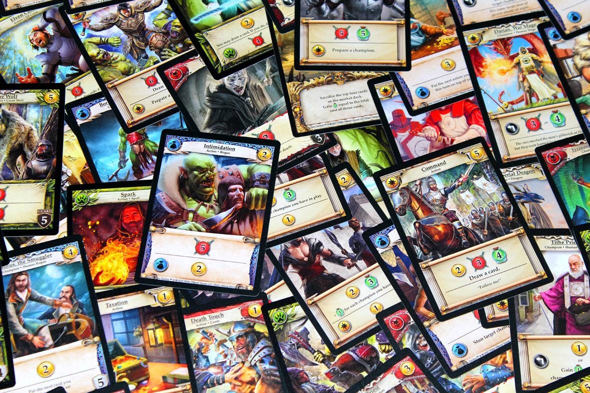 Each player starts the game with a ten-card personal deck containing gold (for buying) and weapons (for combat). You start each turn with a new hand of five cards from your personal deck. When your deck runs out of cards, you shuffle your discard pile into your new deck. An 80-card Market deck is shared by all players, with five cards being revealed from that deck to create the Market Row. As you play, you use gold to buy champion cards and action cards from the Market. These champions and actions can generate large amounts of gold, combat, or other powerful effects. You use combat to attack your opponent and their champions. When you reduce your opponent's score (called health) to zero, you win!