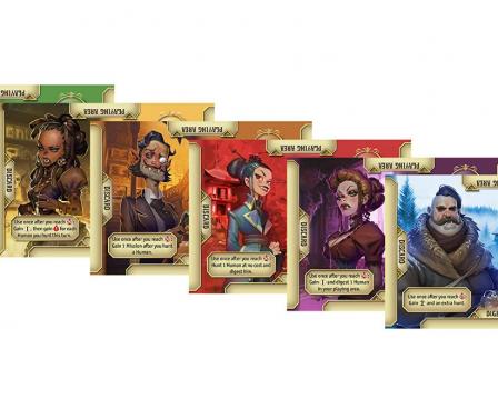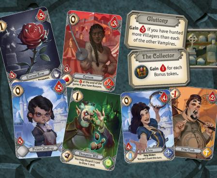 During the game, players spend "speed" to move their vampires around the map, hunt humans worth victory points, and add new cards to their deck.