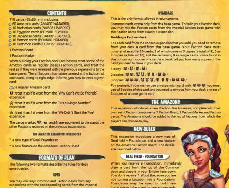 Amazons extensively use cards with the “building bonus”. Most of their faction cards are useful, and produces valuable resources only when built, while usually having only the foundation as their cost. That minor change is in fact huge for how we treat our faction buildings. Amazons are a unique faction that will not discard their faction foundation when used to build another card, and will put back in their faction deck instead.