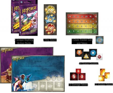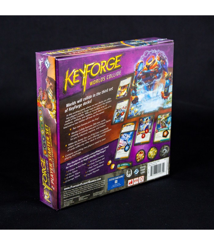 Along with this new set of KeyForge comes a wide variety of ways for you to jump into the game. In addition to the individual KeyForge: Worlds Collide Archon Decks, this set also offers the KeyForge: Worlds Collide Two-Player Starter Set, which provides you with all the tools you need to either begin or expand your adventures on the Crucible, including two unique Worlds Collide Archon Decks, a Quickstart Rulebook, two poster playmats, and all the keys, tokens, and chain trackers two players need to start playing.