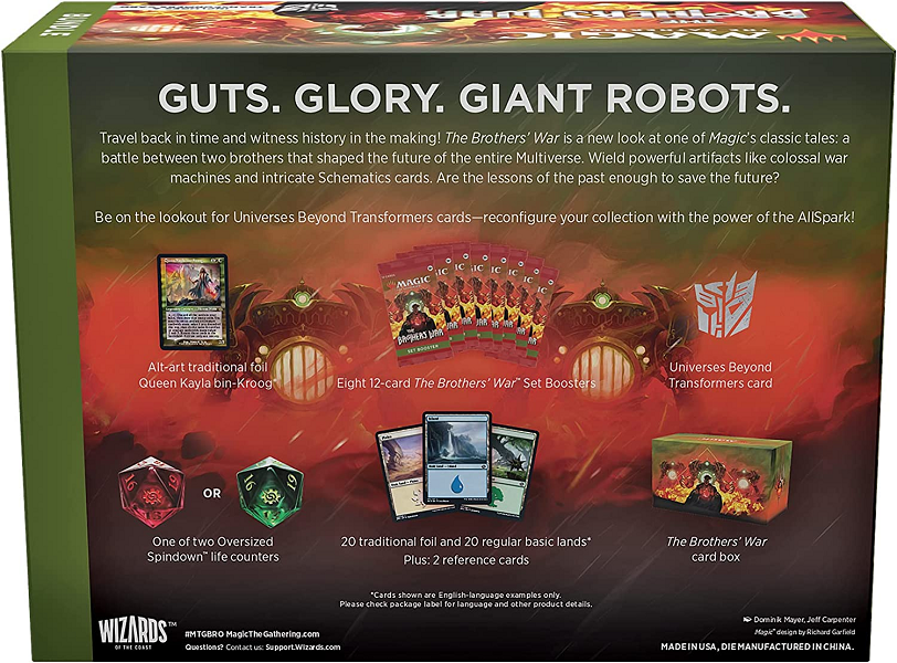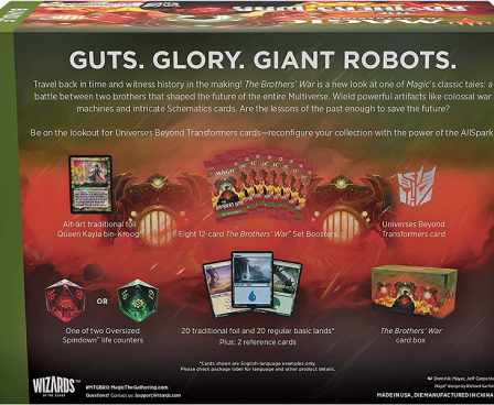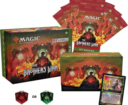 The Brothers’ War Bundle contains 8 The Brothers’ War Set Boosters—the best boosters to open just for fun—plus accessories, with 1 Universes Beyond Transformers card, 1 Traditional Foil Retro-Frame promo card with Bundle-exclusive alternate art—Queen Kayla bin-Kroog, 40 basic lands (20 Traditional Foils and 20 nonfoils), 1 oversized Spindown life counter (red or green), 1 card storage box, and 2 reference cards. Each The Brothers’ War Set Booster contains 12 Magic cards, 1 Art Card, and 1 token/ad card or card from “The List” (a special card from Magic's history—found in 25% of packs), with a combination of 1–5 card(s) of rarity Rare or higher and 3–7 Uncommon, 3–6 Common, and 1 Land cards. Traditional Foil Land replaces basic land in 20% of Set Boosters. Foil-Stamped Signature Art Card replaces Art Card in 10% of packs. Transformers card in 10% of Set Boosters.