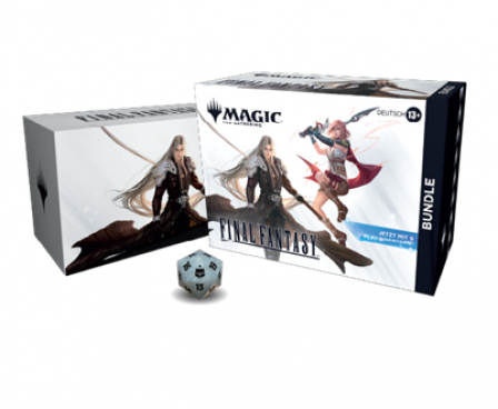 BUNDLE CONTENTS—9 Magic: The Gathering—FINAL FANTASY Play Boosters, 2 Traditional Foil Extended-Art cards, 32 Full-Art Land cards (16 foil, 16 nonfoil), 1 Spindown life counter, 1 card storage box, and 2 reference cards