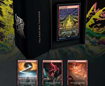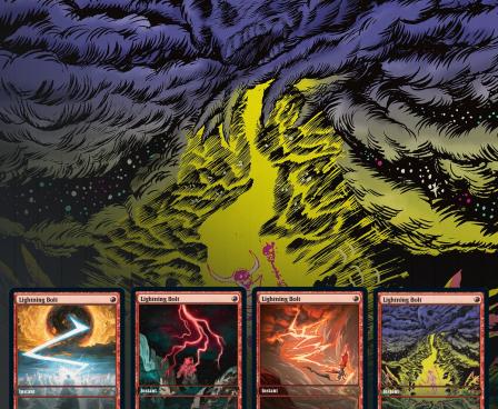 This drop celebrates the quintessential red spell: the humble and efficient Lightning Bolt. Whether it’s destroying your opponent’s mana dork on turn one or simply being hurled into their face, Lightning Bolt does it all, as long as “all” can be done with three direct damage. Each piece shows a different creature getting totally wrecked by the cruel and unforgiving power of nature (out of respect for the feelings of Ornithological Studies, birds will be getting a pass). These full-art foil cards feature electrifying, brand-new art by Noah Bradley, Brigitte Roka, Robbie Trevino, and Alexis Ziritt.