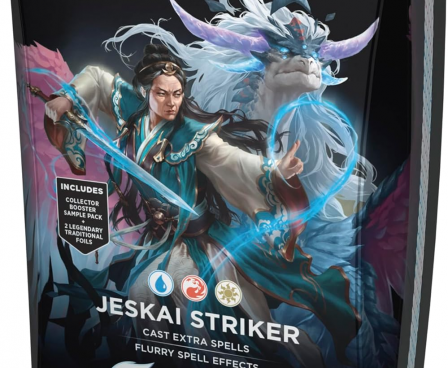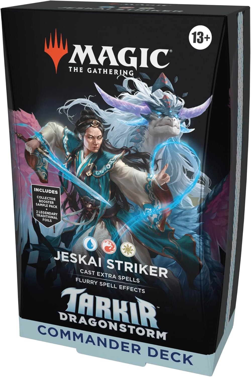 CONTENTS—1 ready-to-play Jeskai Striker Tarkir: Dragonstorm MTG Commander Deck (100 cards), a 2-card Collector Booster Sample Pack, 10 double-sided tokens, and 1 deck box
