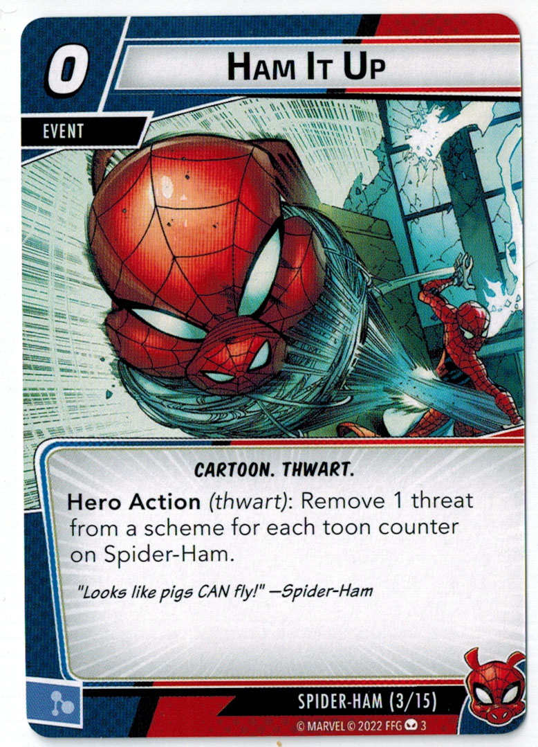 Greetings, citizens! You’ve met high-flying heroes, super-genius scientists, and cosmic sorcerers. You’ve seen awe-inspiring Avengers, grandstanding Guardians, and wondrous Web-Warriors. Now, it’s time for the porcine powerhouse, the spectacular super-pig, the wacky web-slinger, the one and only…Spider-Ham! This cartoon wonder WHAMs his way into players’ games of Marvel Champions: The Card Game with zany aplomb. Utilizing his wacky cartoon physics and goofy antics, Spider-Ham can take hits like a champ and thwart villains’ schemes with all sorts of colorful nonsense. With this Hero Pack, players will find Spider-Ham, his fifteen signature cards, and a full assortment of Justice cards inviting them to ruin the villains’ plans. This pack also includes a bonus modular encounter set featuring the iconic and terrifying Inheritors.