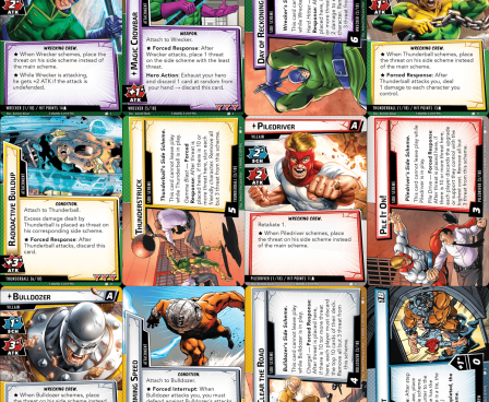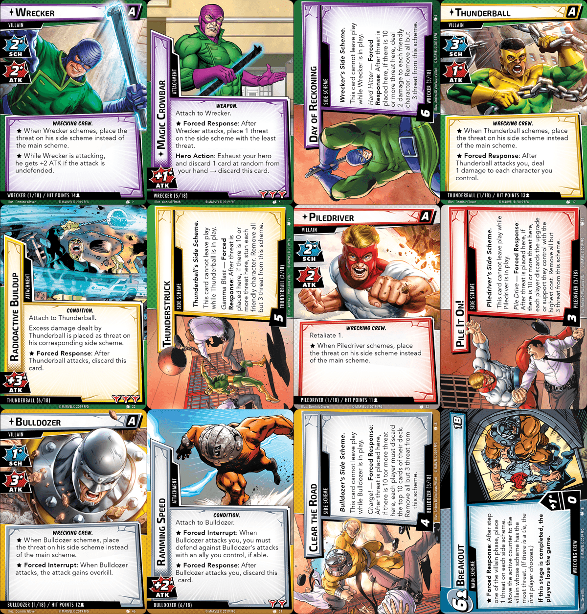 With 73 brand-new cards, this single scenario puts four villains in play at once, each with their own side scheme and deck. Can your heroes withstand the assault from Wrecker, Piledriver, Bulldozer, and Thunderball?