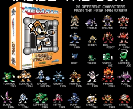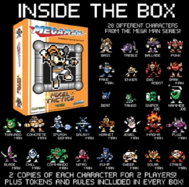 Mega Man Pixel Tactics: Bass Orange Edition is a box containing two copies of all the unlocked stretch goals from the Mega Man Pixel tactics Kickstarter campaign, including all the social goals, bringing a total of 28 different new characters to the table! This is also playable on its own.