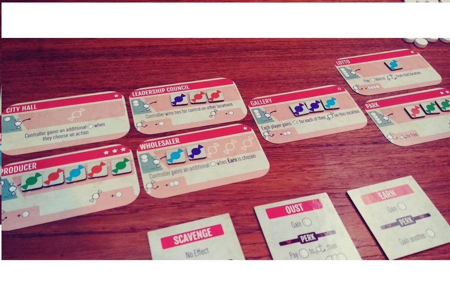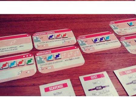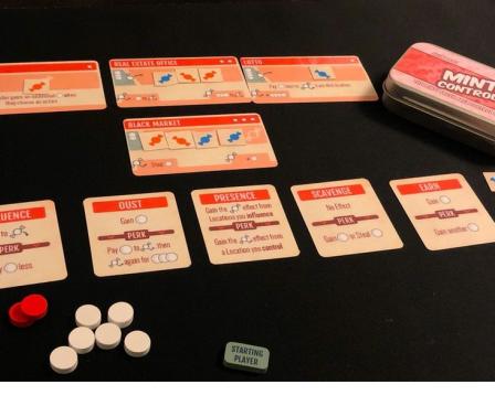 Each player has five influence tokens that are placed onto buildings (that represent presence and potentially control). The first person to play all influence tokens ends the game. For each location, the player who has control of that location (determined by having more influence tokens than each other player), earns the victory points associated with that location (represented by stars in the top-right corner). During play, if a player has presence on a card, they can use the actions on the cards by paying their cost. These are effects like: kicking other players out of a location, taking more mints, and placing influence tokens.