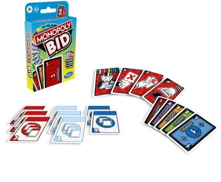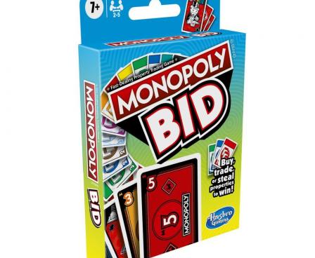 Get ready for an exciting quick-playing Monopoly card game! The Monopoly Bid game is a game of chance, luck, and strategy as players bid in blind auctions, pay with money cards, steal properties with Action cards, and change their luck with Wild cards. Played in rounds, everyone gets a chance to host an auction. When it's time to bid on a property, players choose how much money they want to risk. Then everyone shouts, "1, 2, 3, Bid!" and lays their money cards down. The player who bid the most money gets that property. Collect 3 property sets to win. The Monopoly Bid game is a great choice for game night, for parties, and as an indoor activity for kids 7 and up.
