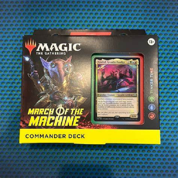 This March of the Machine Commander Deck set includes 1 ready-to-play deck of 100 Magic cards (2 Traditional Foil Legendary cards, 98 nonfoil cards), 10 specialty cards, a 2-card Collector Booster Sample Pack, 1 Foil-Etched Display Commander (a thick cardstock copy of the commander card with foil etched into the card’s border and art), 10 double-sided tokens, 1 deck box (can hold 100 sleeved cards), 1 Life Wheel, 1 special die, 1 strategy insert, and 1 reference card.
