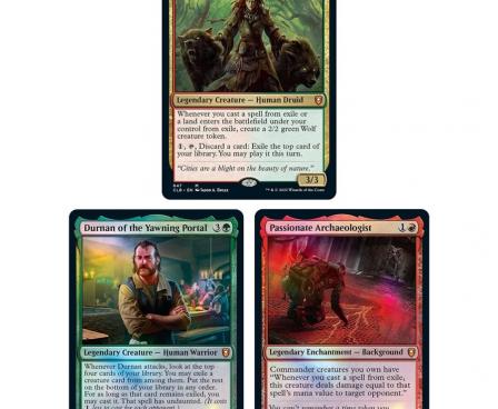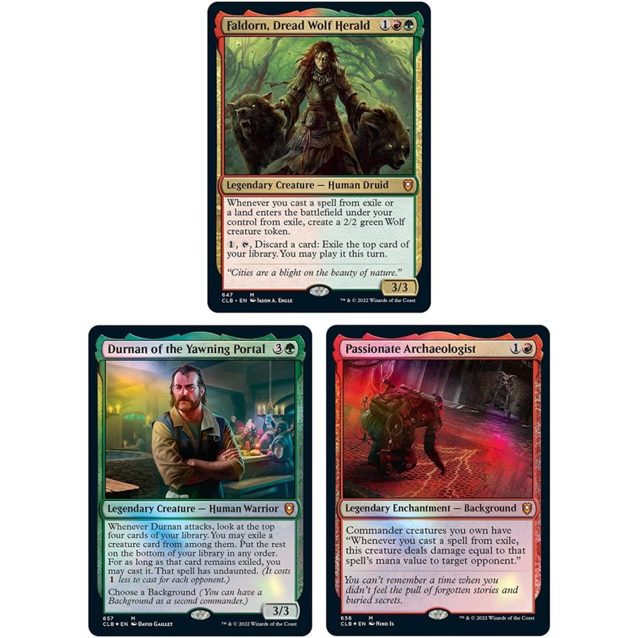 Commander Legends: Battle for Baldur's Gate introduces four new Commander decks. Each Commander deck includes a legendary "face" Commander as well as an alternate legend, plus a Background to use as Commanders. In total, each deck contains ten new-to-Magic cards.