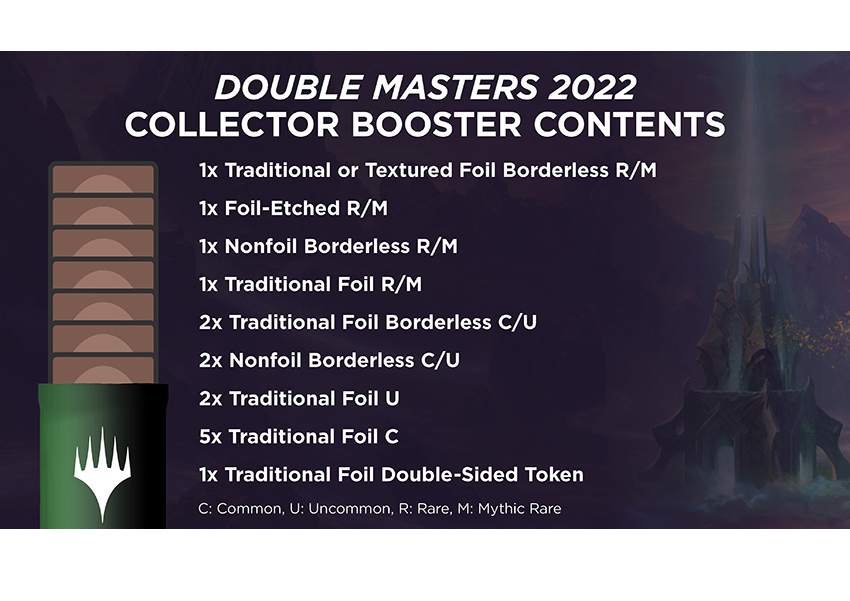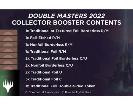 The Double Masters 2022 Collector Booster Box contains 4 Double Masters 2022 Collector Booster Pack. Each Pack contains 15 cards and 1 traditional foil double sided token with a combinations of 4 cards of rarity rare or higher.