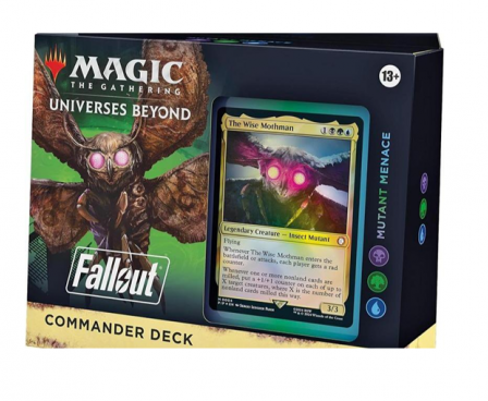 About this item: THE VAULTS ARE OPEN—Journey through the wastes with a 100-card deck introducing 41 never-before-seen Magic cards featuring fan-favorite characters, thematic game mechanics, and art that explores the post-nuclear world of the Fallout series BATTLE YOUR FELLOW WASTELANDERS—Battle your friends in epic 3–5 player MTG games full of strategic plays and social intrigue; ready-to-play right out of the box, these preconstructed decks let you jump straight into the action MUTANT MENACE—Choose the Mutant Menace deck to place your belief in The Wise Mothman and prove that humanity’s time at the top of the food chain is over COLLECT SPECIAL FALLOUT CARD TREATMENTS—Each deck comes with a Collector Booster Sample pack containing 2 special alt-frame cards, including 1 Rare or Mythic Rare card EVERYTHING YOU NEED TO PLAY AND MORE—Each deck also comes with 10 double-sided tokens, 1 life tracker, 1 strategy guide, and 1 deck box (can hold 100 sleeved cards) A GAME THAT FUSES ART, STORIES amp; STRATEGY—Magic: The Gathering is a collectible card game that weaves deep strategy with art and mechanics that explore the themes of a particular world and story—whether you want to play a casual game with friends, collect cool cards, or get competitive, Magic welcomes you to The Gathering