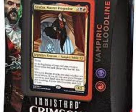 Crimson Vow Commander Decks—Vampiric Bloodline. Comes in a minimally-packaged box that includes all the same contents but with 45% less packaging waste and 98% less plastic than previous Commander decks Each box contains 1 ready-to-play deck of 100 Magic cards (2 traditional foil, 98 nonfoil), 1 foil-etched Display Commander (a thick cardstock copy of the commander card with textured foil etched into the card’s border and art), 10 double-sided tokens, 1 deck box (can hold 100 sleeved cards), 1 life tracker, and 1 reference card.