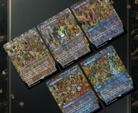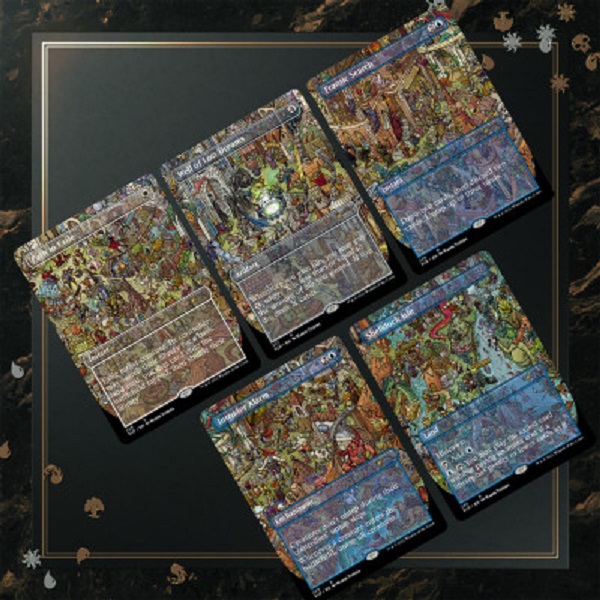 Yes, that’s right. It’s a five-card, Borderless panorama by Marija Tiurina, and it’s jam-packed with hidden Magic and Ravnica references. Please, can you find Fblthp on every card?